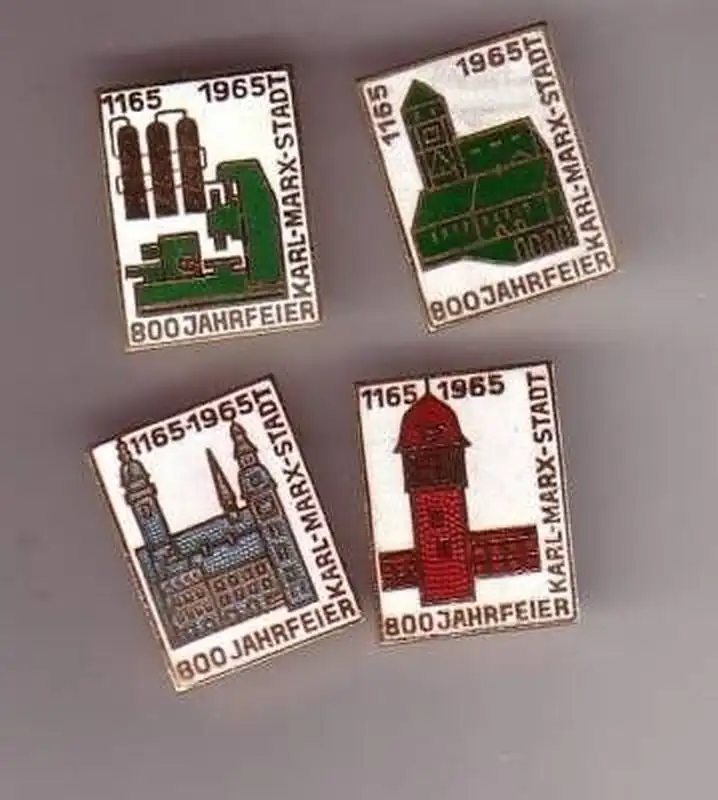 4 seltene emaillierte Abzeichen zur 800 Jahrfeier von Karl Marx Stadt 1165-1965,
