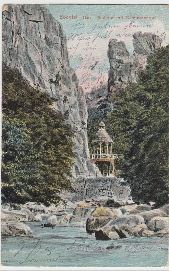 - (44027) Ansichtskarte, postcard, PPC - Bodetal, Bodetor mit Kronentempel, 1909