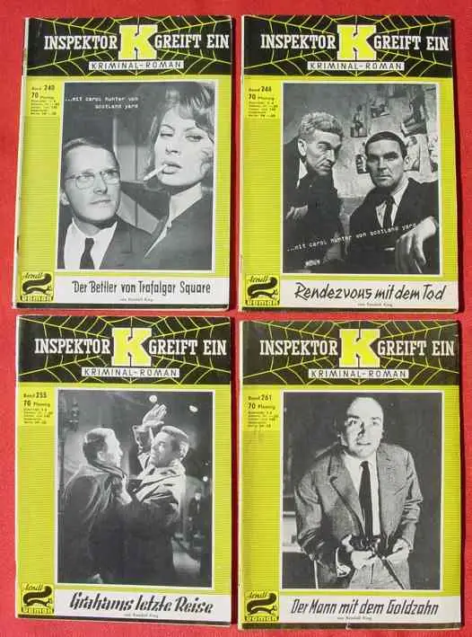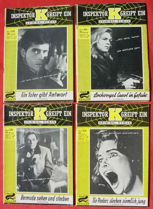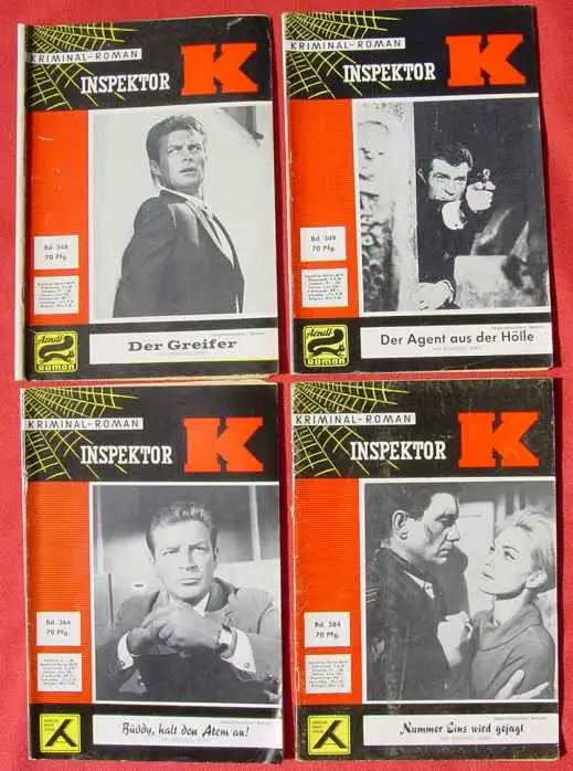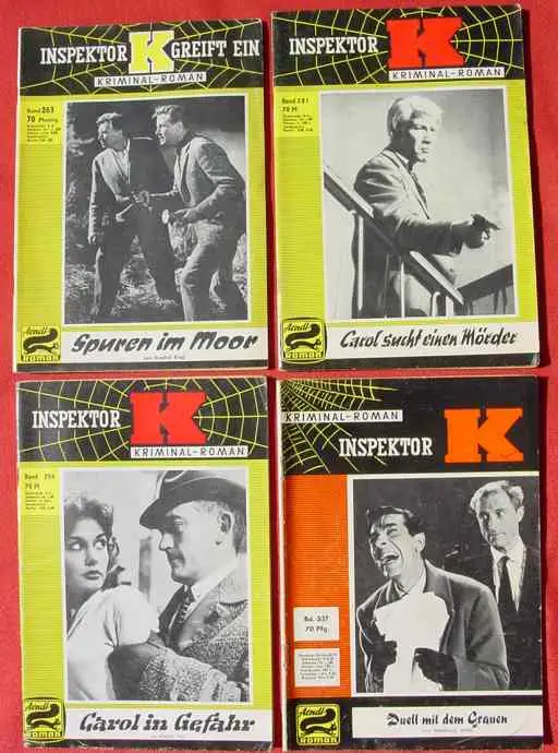 46 verschiedene Hefte der Reihe : 'Inspektor K'. Auch bekannt unter 'Spinne im Netz'. Kriminalromane. Herausgeber dieser Heftreihe : Nordwestdeutscher Presse- u. Buchvertrieb GmbH. / spaeter Erich Arndt Verlag, Hagen u. Karlsruhe u.a