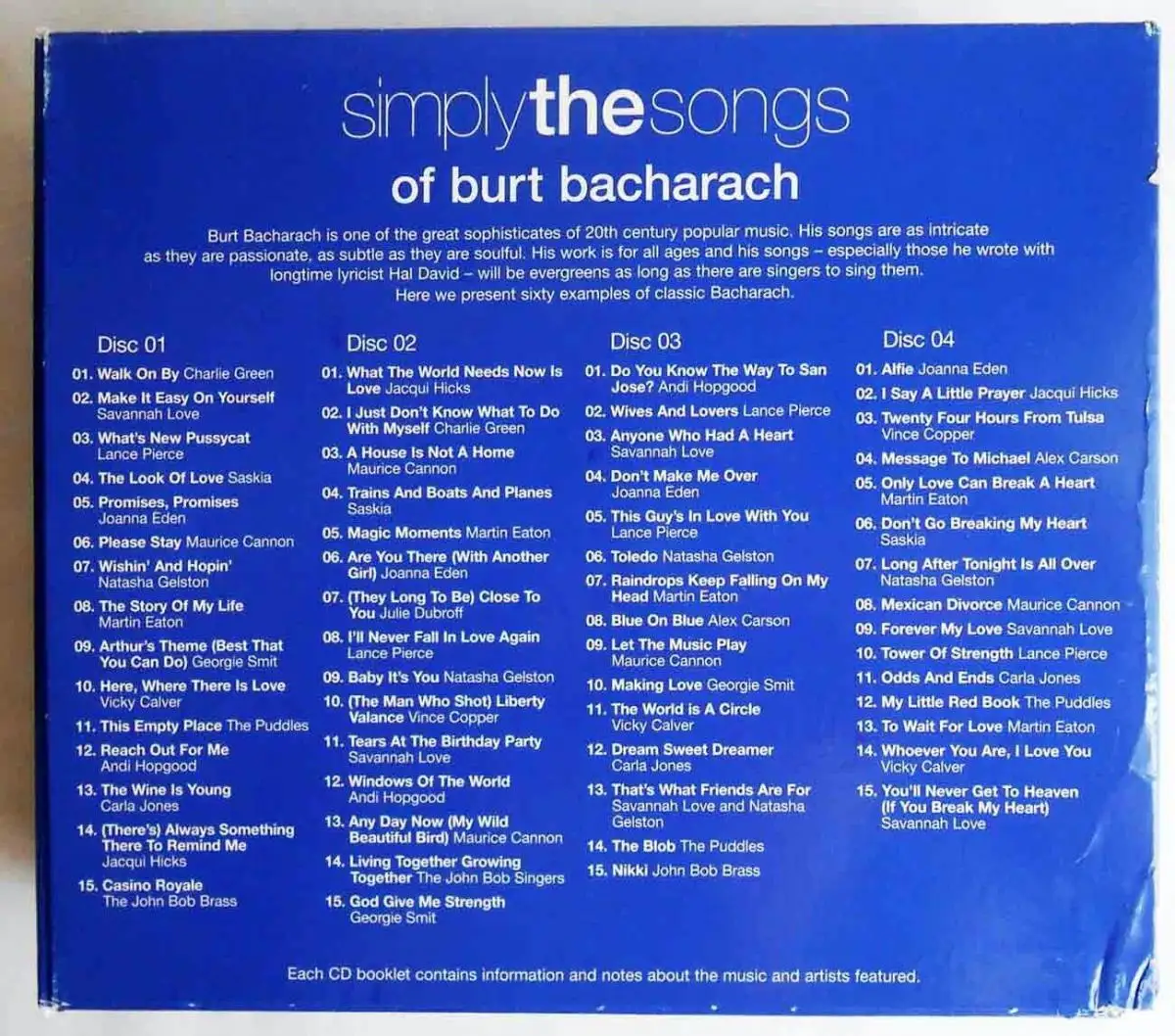 4CD Box, Die großen Erfolge des legendären Komponisten Burt Bacharach - - feat Martin Eaton, Vicky Carter, Carla Jones, John Bob Brass, Savannah Love usw...
