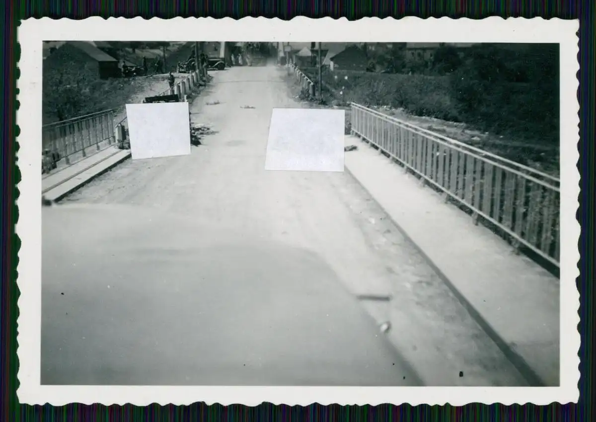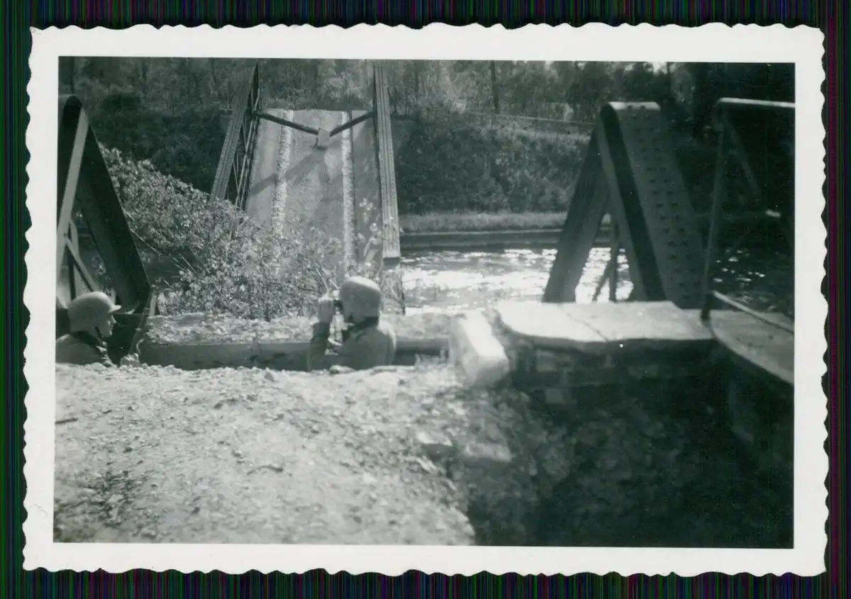 4x Foto Westfront zerstörte Brücke Soldat Wehrmacht beobachtet mit Fernglas