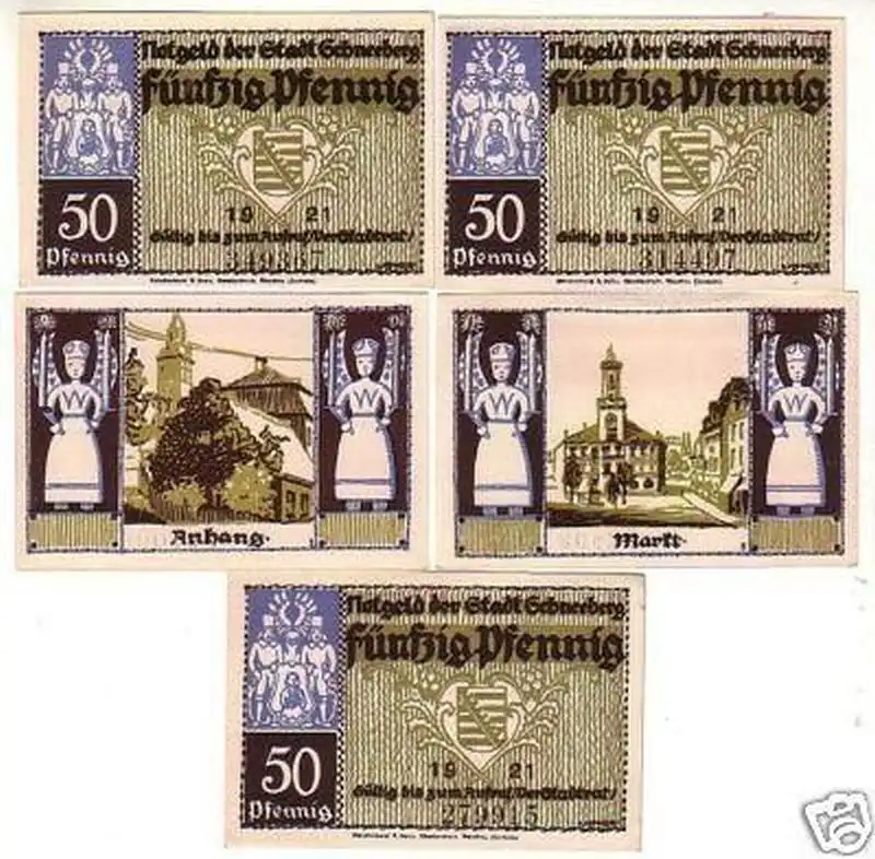 5 Banknoten Notgeld der Stadt Schneeberg 1921