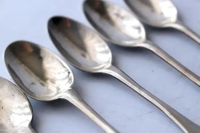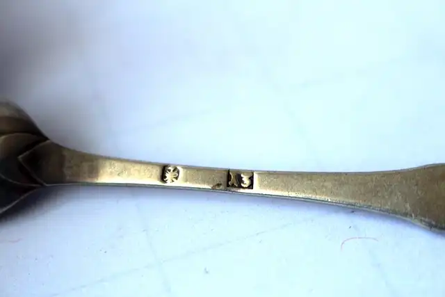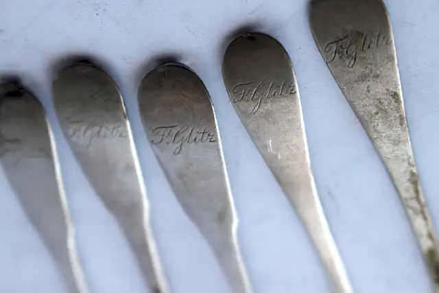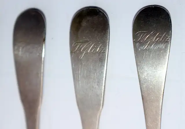 5 Kaffeelöffel punziert mit Meistermarke (nicht erkennbar), Silber 13 Lot, ungereinigt, unpoliert, mit Initialen Rückseite "F. Glitz" für Friedrich Wilhelm Glitz, geb. 01.05.1839, Todestag unbekannt, Initialen auf der Vorderseite "EN" für Elisabeth Neuhaus (1898 - 1989), Gewicht 1 Löffel 11g; 5 Löffel 56g, Länge: 11,5; Breite: 2,0 cm