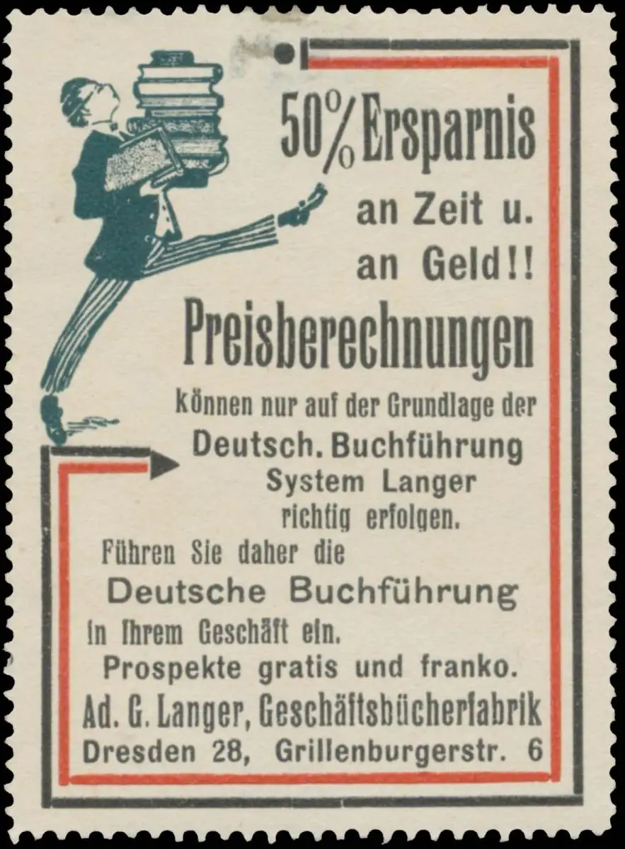 Preisberechnungen können nur auf der Grundlage der Deutsch. Buchführung System Langer richtig erfolgen., Größe/Zustand: 6x5 , leicht beschädigt, Original alte Reklamemarke die seinerzeit für die Werbung benutzt wurde