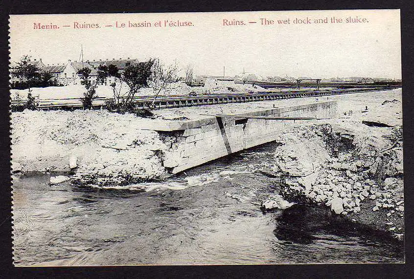 53676 Ansichtskarte Menin Menen Ruines Ruins The wet dock and the sluice le bassin Schleuse um 1915 Belgien