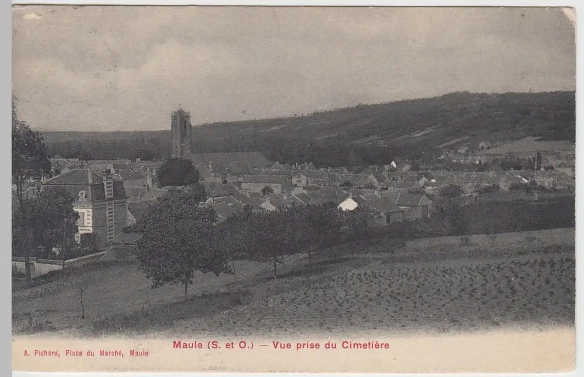 - (57251) Ansichtskarte, postcard, PPC - Maule, Ortsansicht, Kirche Saint-Nicolas 1912