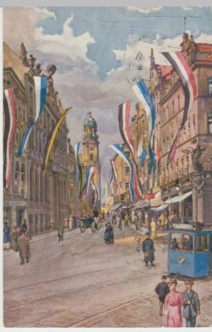- (5971) Ansichtskarte, postcard, PPC - München, Theatinerstraße im Flaggenschmuck, Feldpost 1916