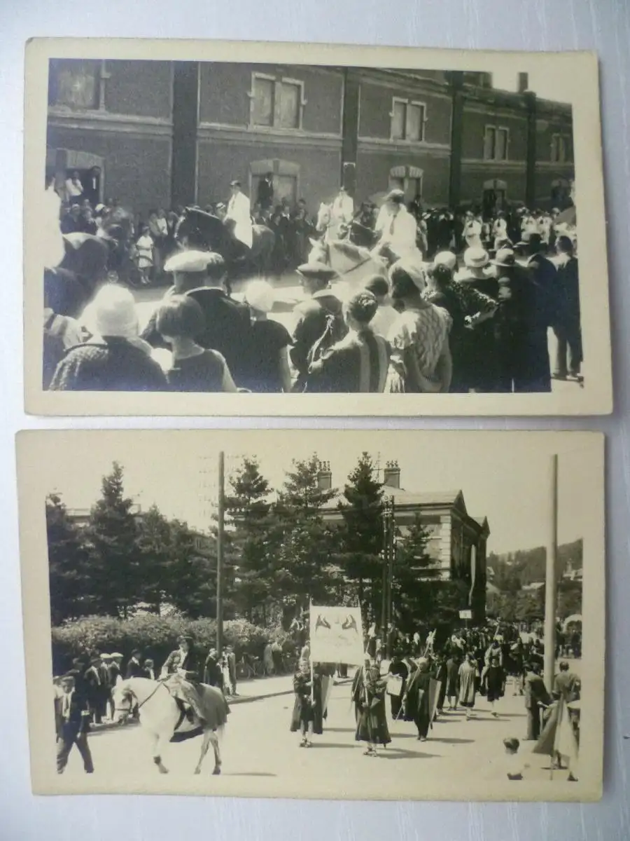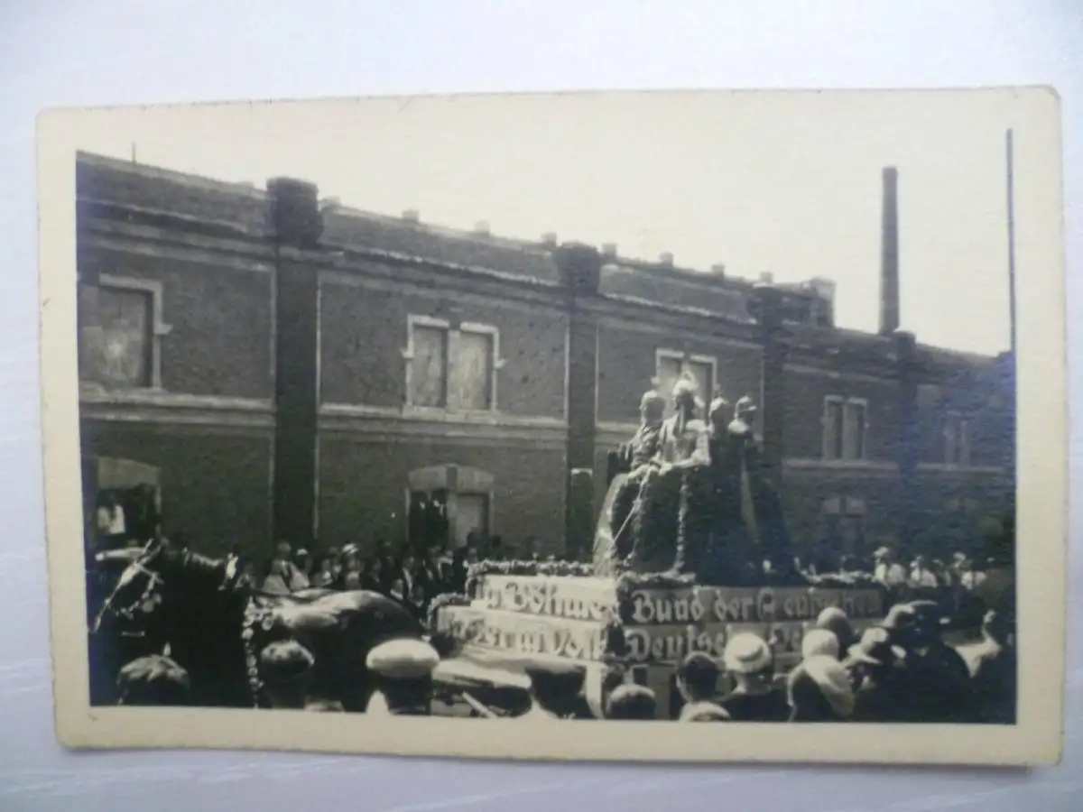 Sammlung von 6 seltenen Ansichtskarten eines Festumzuges aus Bad Elster, wohl späte 1920er oder frühe 1930er Jahre, sicher vor 1933. Auf einem Bild ist ein Festwagen vom Bund der Deutschen in Böhmen zu sehen. Rückseitig mit Bleistift bezeichnet "Bad Elster". Alle ungelaufen und gut erhalten.