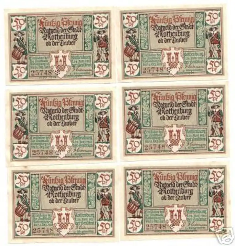 6 Banknoten Notgeld Stadt Rothenburg o.Tauber 1921