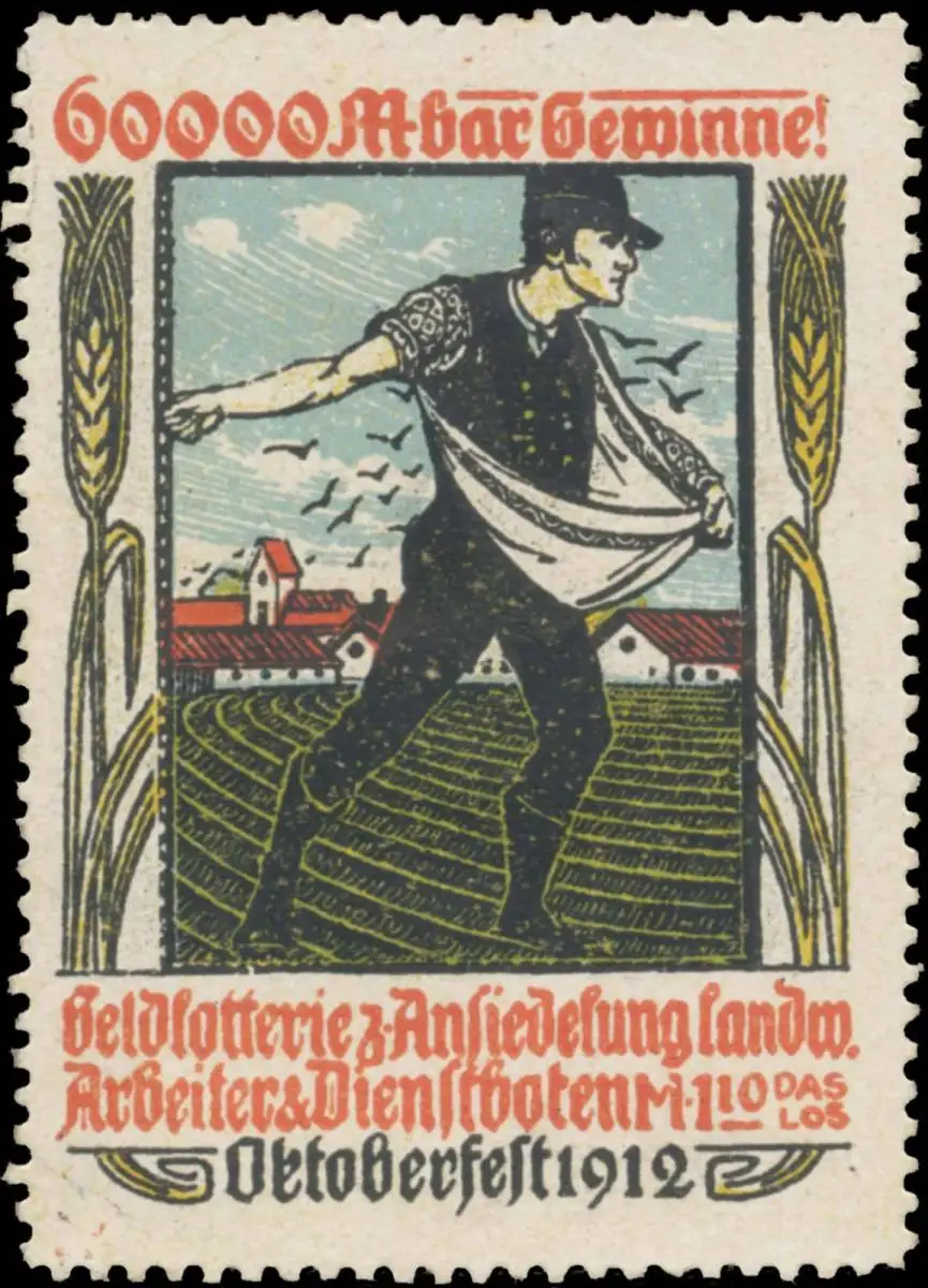 Goldlotterie Ansiedlung landwirtschaftlicher Arbeiter und Dienstboten, Oktoberfest, Größe/Zustand: 6x4 , guter Zustand, Original alte Reklamemarke die seinerzeit für die Werbung benutzt wurde