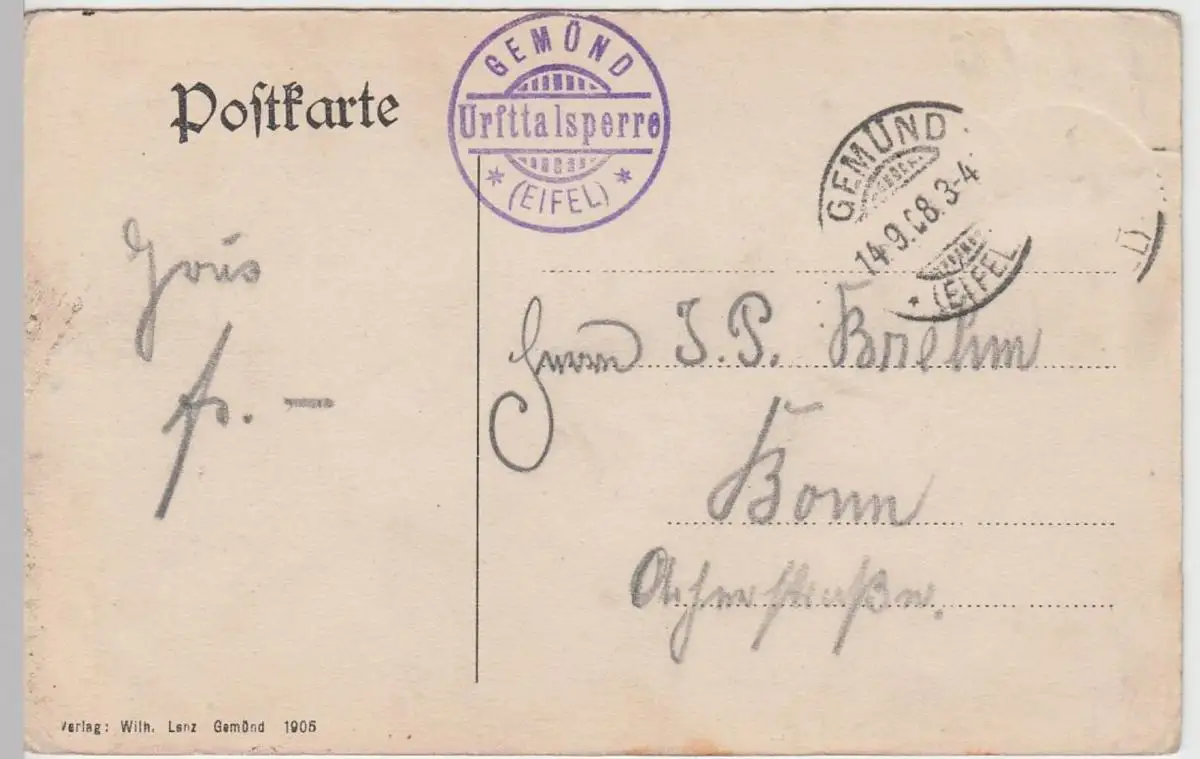 - (60185) Ansichtskarte, postcard, PPC - Urfttalsperre bei Gemünd, 1908