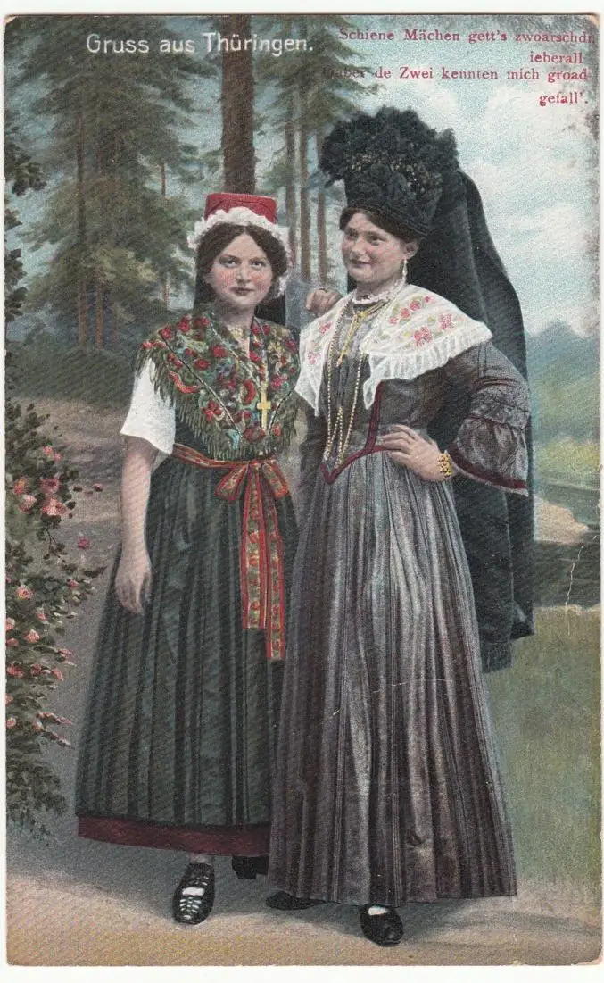 - (62900) Ansichtskarte, postcard, PPC - Thüringer Trachten, "Schiene Mächen gett's zwoarschdn ieberall"