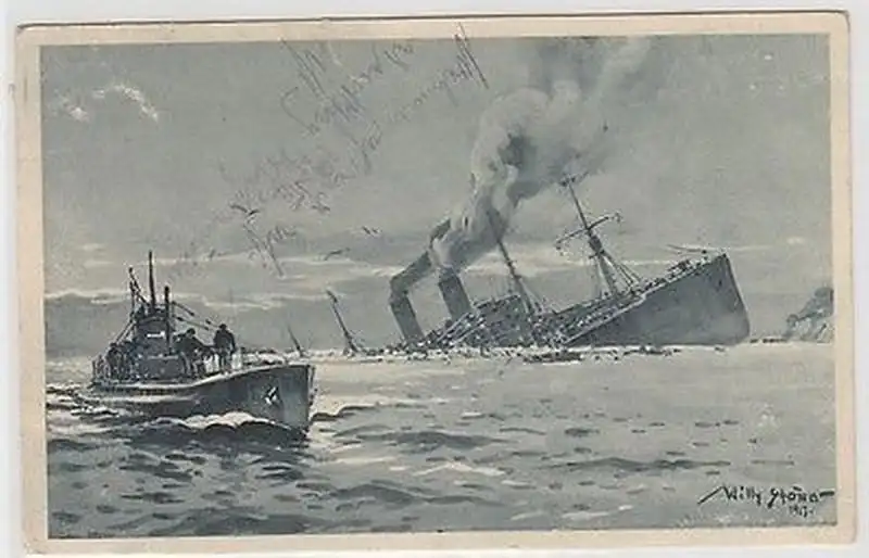 Versenkung eines feindlichen bewaffneten Truppentransportdampfers, Aquarell von Willy Stöwer, gelaufen, gute Erhaltung siehe Bild,