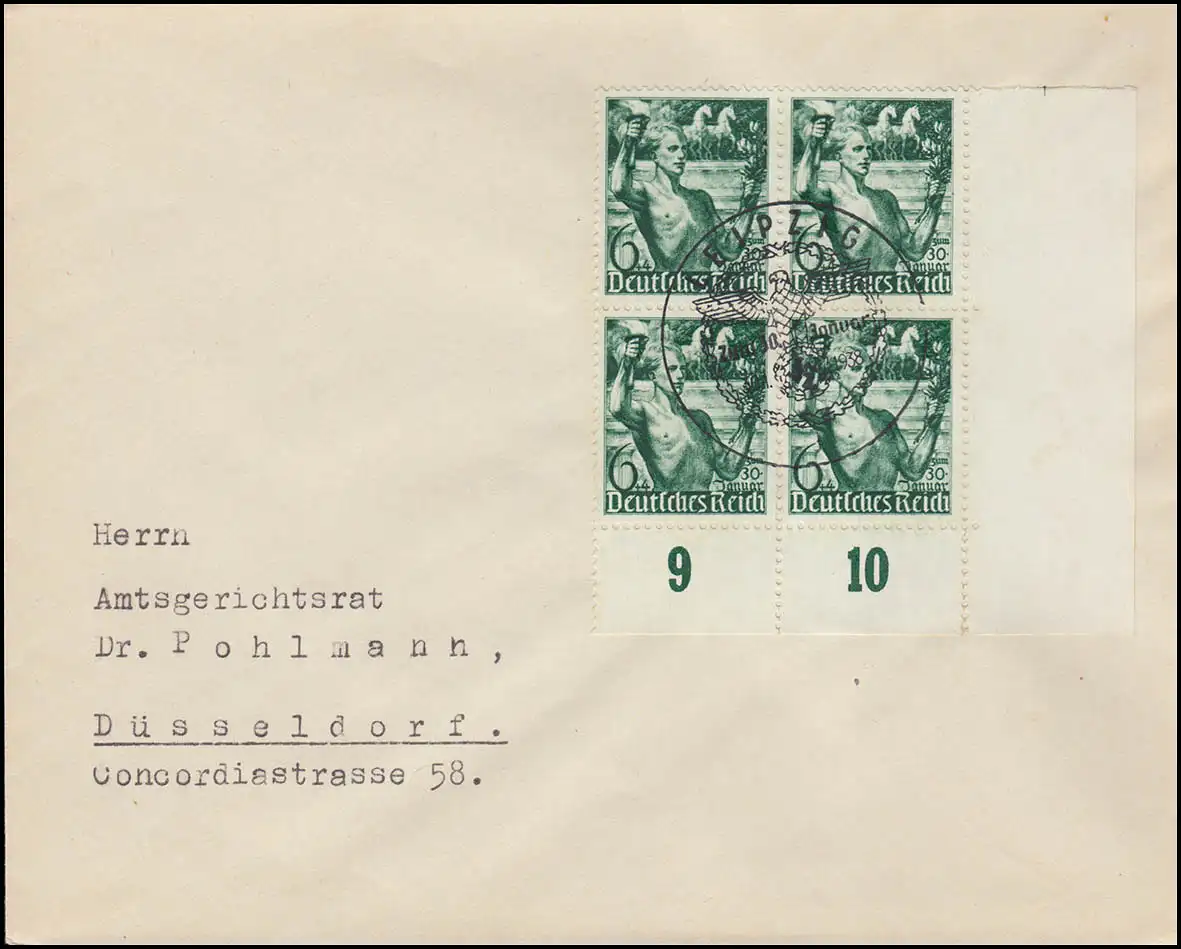 660 Machtergreifung: Viererblock auf Brief passender SSt LEIPZIG 30.1.38