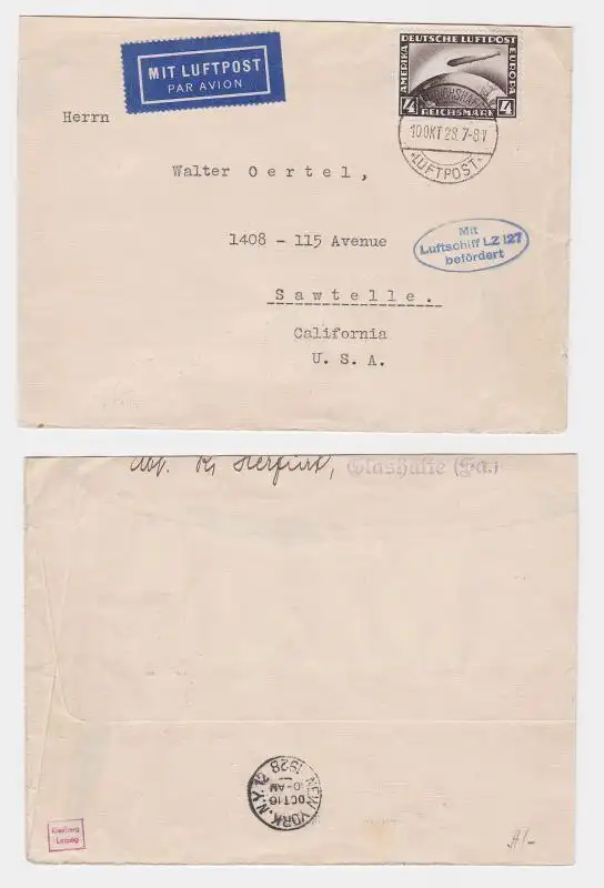 Hoher Katalogwert, Frankatur mit 4 Reichsmark Zeppelinmarke (Michel 424), gelaufen am 10. Oktober 1928, Glashütte nach Sawtelle via Friedrichshafen und New York, gute Erhaltung, siehe Bild,