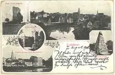 74564 Crailsheim, Mehrbild (4) Ruine v. Kloster Anhausen, Wilhelmshöhe, Partie a.d. Jagst bei der Herrenmühle, Pyramide a.d. Wilhelmshöhe, o 07.08.1903