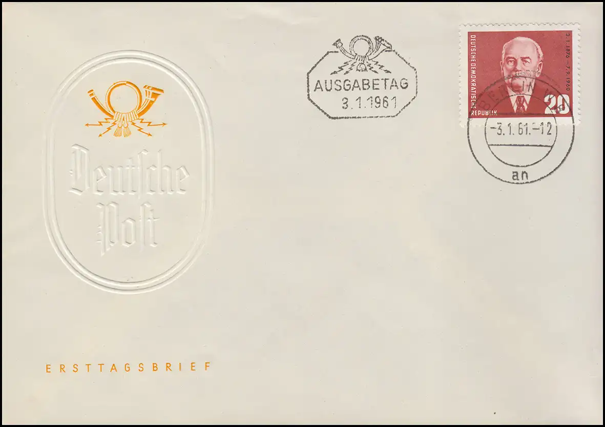 807 Wilhelm Pieck 1961 - Marke auf Schmuck-FDC ET-O BERLIN W8 - 3.1.61