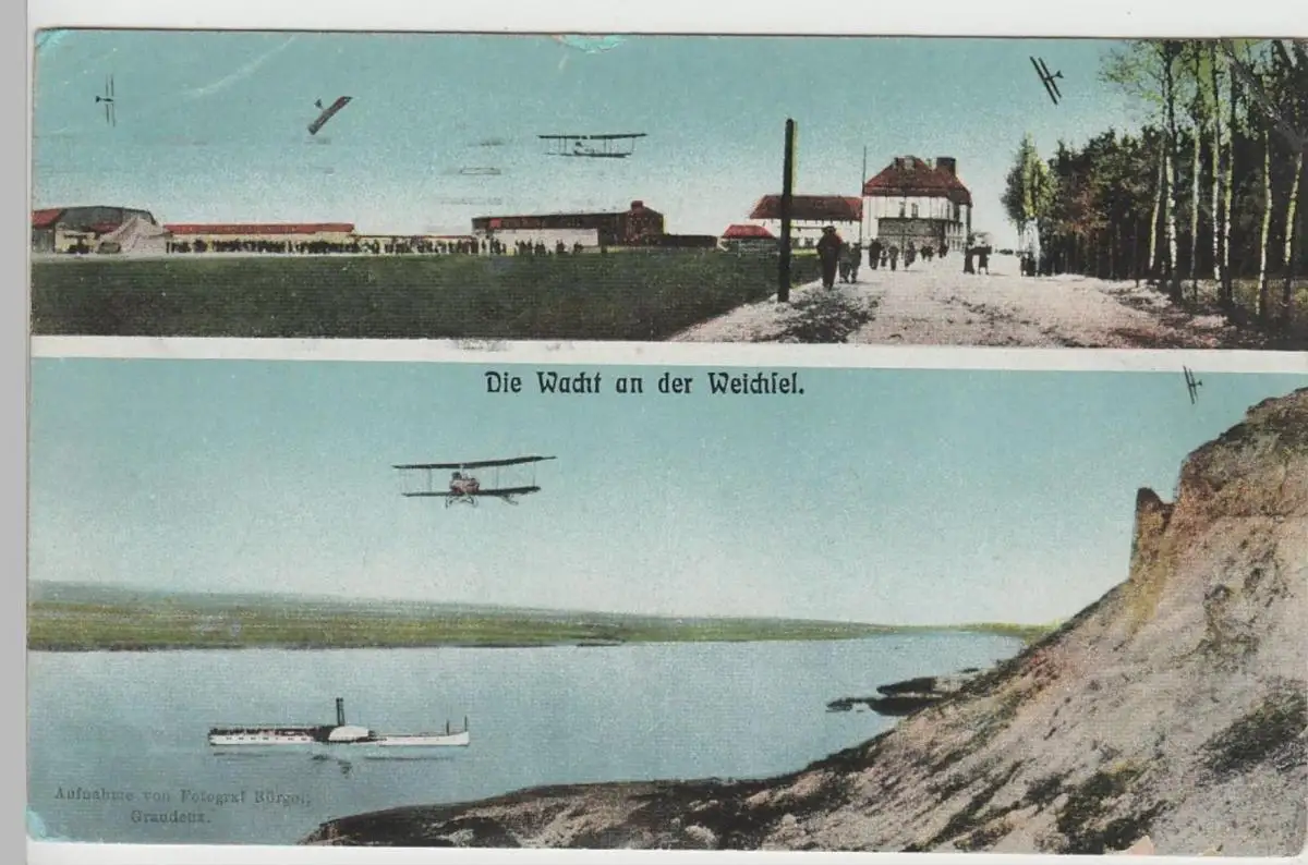 - (83077) Ansichtskarte, postcard, PPC - Flugplatz Graudenz, Doppeldecker über Weichsel 1916