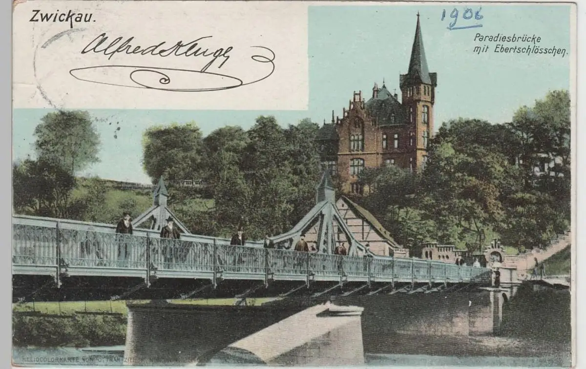 - (83667) Ansichtskarte, postcard, PPC - Zwickau, Paradiesbrücke mit Ebertschlösschen, 1906
