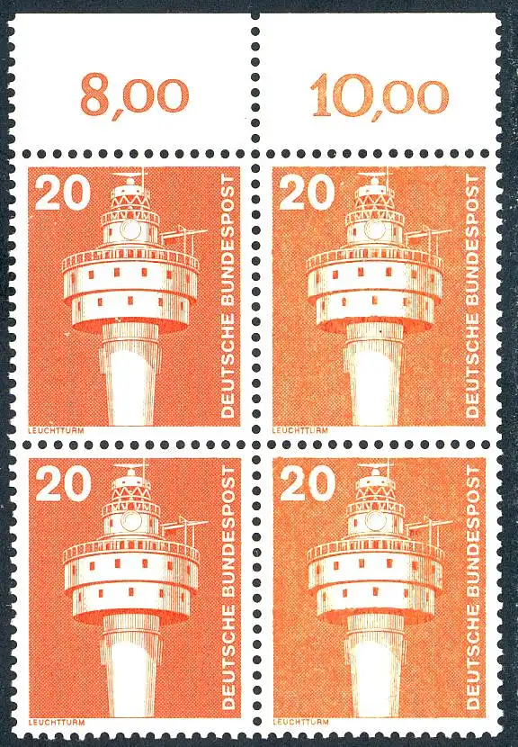 848 IuT 20 Pf Leuchtturm - Oberrand-Viererblock mit Farbverschmierung, **