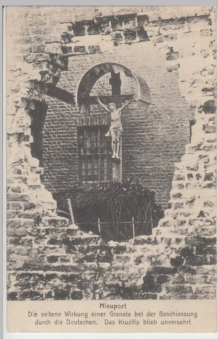 - (89005) Ansichtskarte, postcard, PPC - Nieuport, Nieuwpoort, Granatwirkung an Kirche, Kruzifix, 1915
