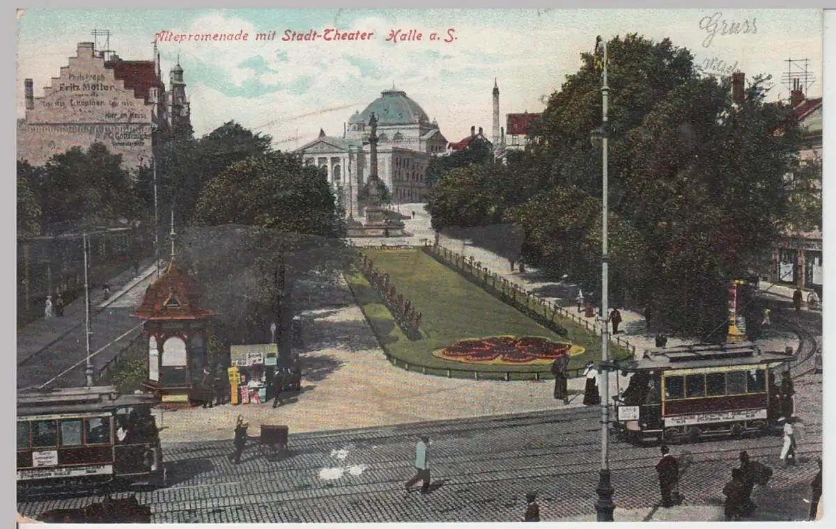 - (89137) Ansichtskarte, postcard, PPC - Halle, Saale, Stadttheater, Straßenbahn, Alte Promenade 1907