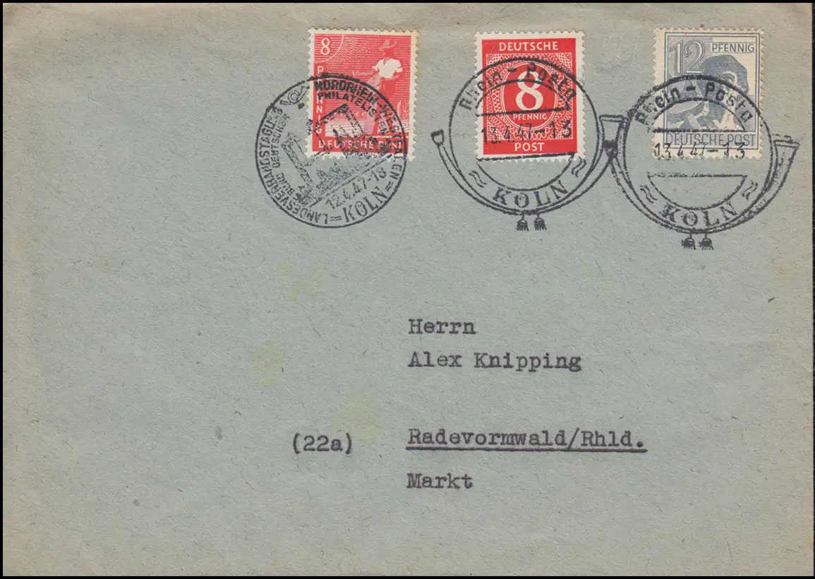 Fernbrief mit 2 Stempel: Sonderstempel KÖLN Landesverbadstagung NRW Bund Deutscher Philatelisten 12.4.47 und Sonderstempel KÖLN Rhein-Posta 13.4.47