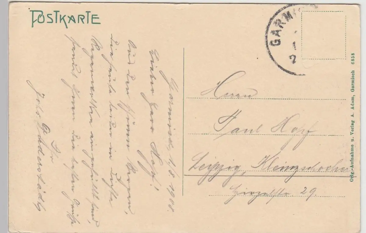 - (92560) Ansichtskarte, postcard, PPC - Garmisch, Ansicht mit Alpspitze u. Zugspitze, 1908