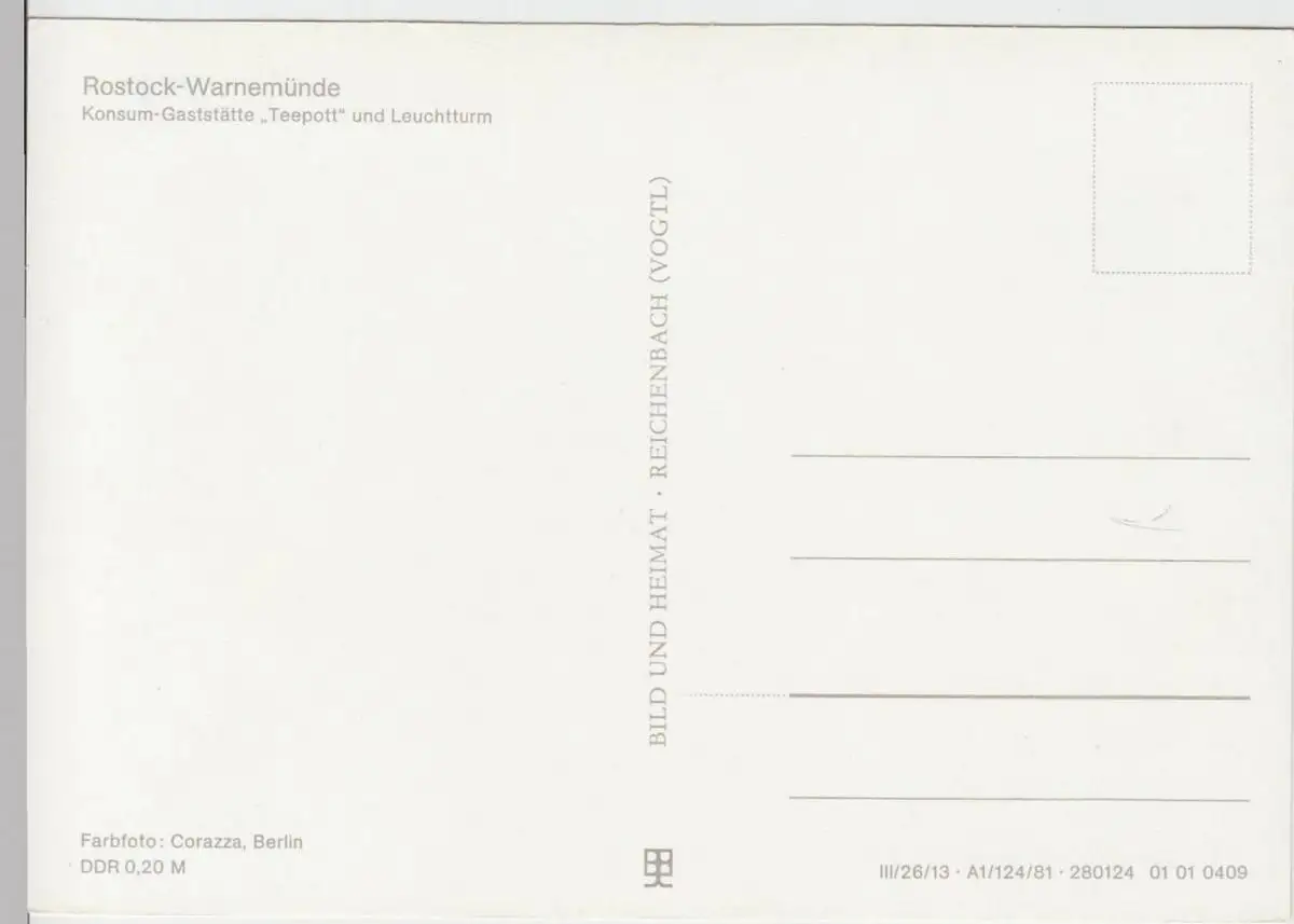 - (99634) Ansichtskarte, postcard, PPC - Warnemünde, Teepott und Leuchtturm, 1981