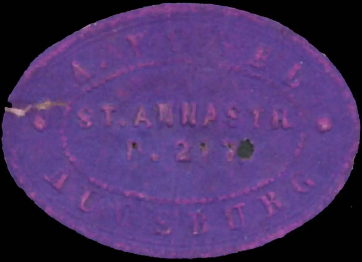 St. Annastraße , Größe/Zustand: 2x3 , beschädigt, Original Verschluss-Siegelmarke aus Papier welche früher von Behörden, Firmen etc. zum Versiegeln der Briefe benutzt wurden