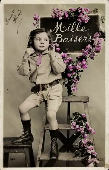 AAk Junge in Uniform, Porträt, Blumen, Kitsch