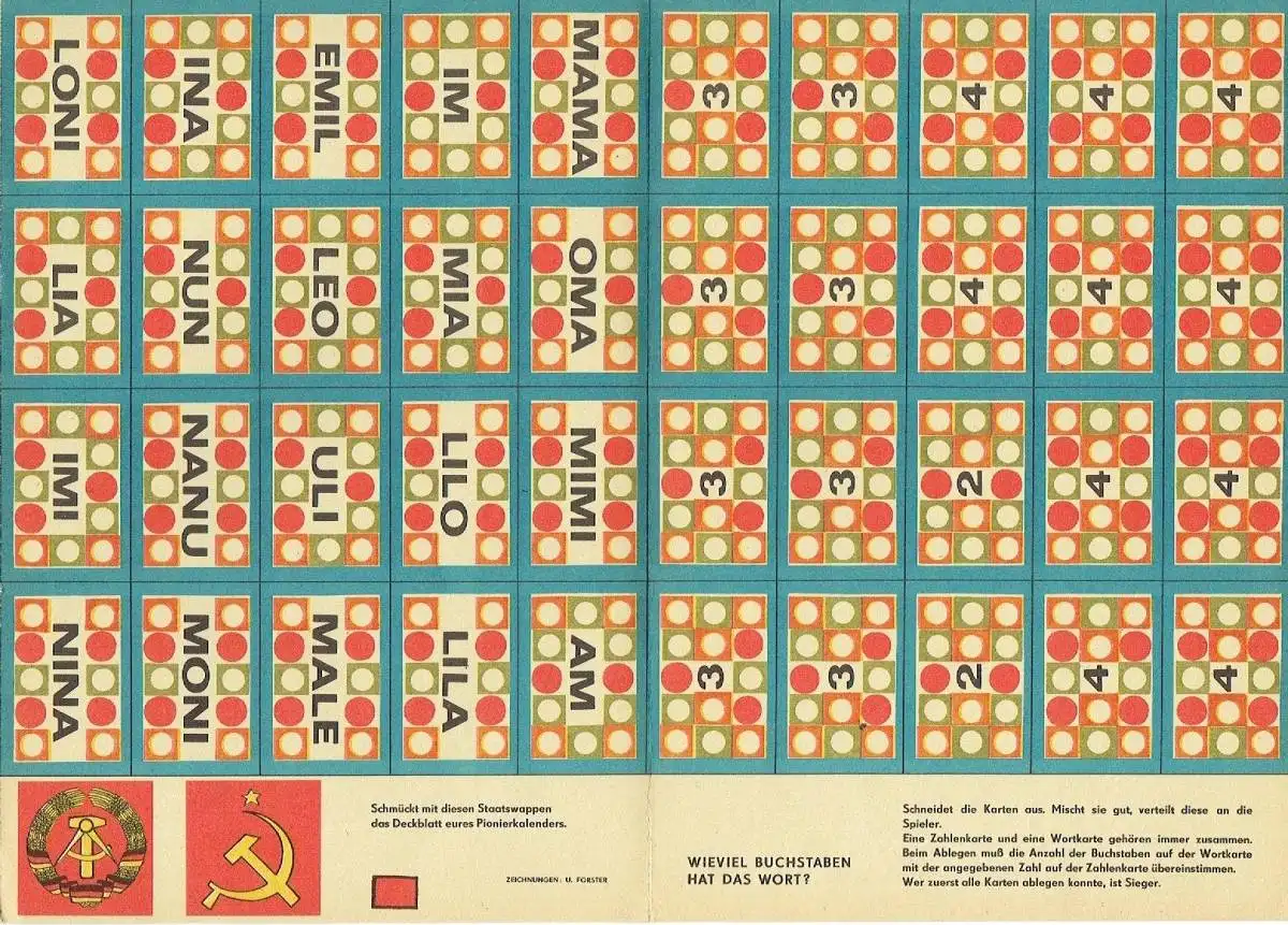 sehr guter Zustand, geringe Gebrauchs- und Alterungsspuren: mit wenigen kleinen Blessuren an Ecken und Rändern, Zeitschrift für Pioniere und Schüler der 1.-3. Klasse mit Kartenspiel als Bastelbeilage mit Illustrationen von Inge Gürtzig, Hans Betcke, Erich Gürtzig, Inge Frost, Inge Friebel, Dieter Pansch, Peter Greinke, Softcover, ca. 20,5 x 29, 16 Seiten mit zahlreichen Bildern + Beilage