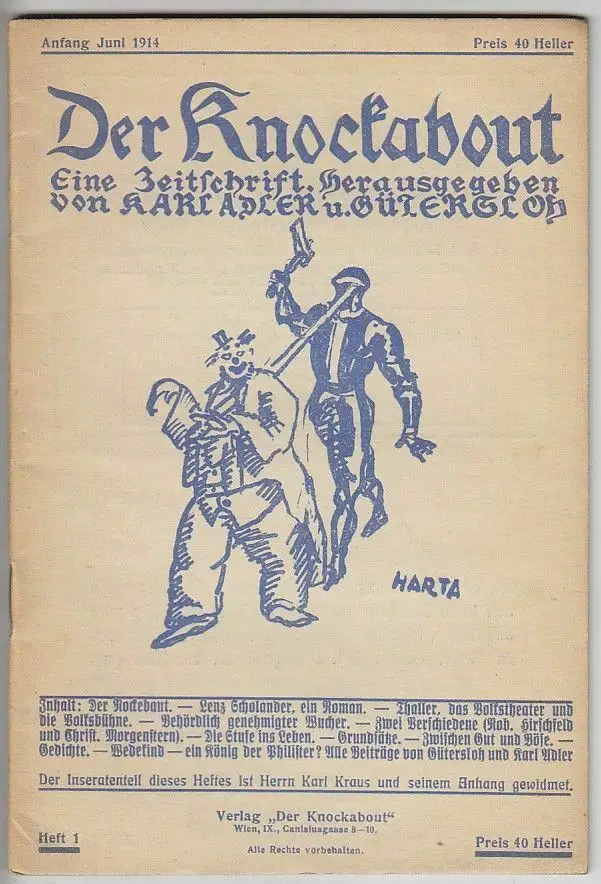 Wien, Vlg. "Der Knockabout" Anfang Juni 1914. Heft 1 (Alles Erschienene!) 31 (1) S. Ogeh. Mit Einbandill v. [Felix Albrecht] Harta. EA