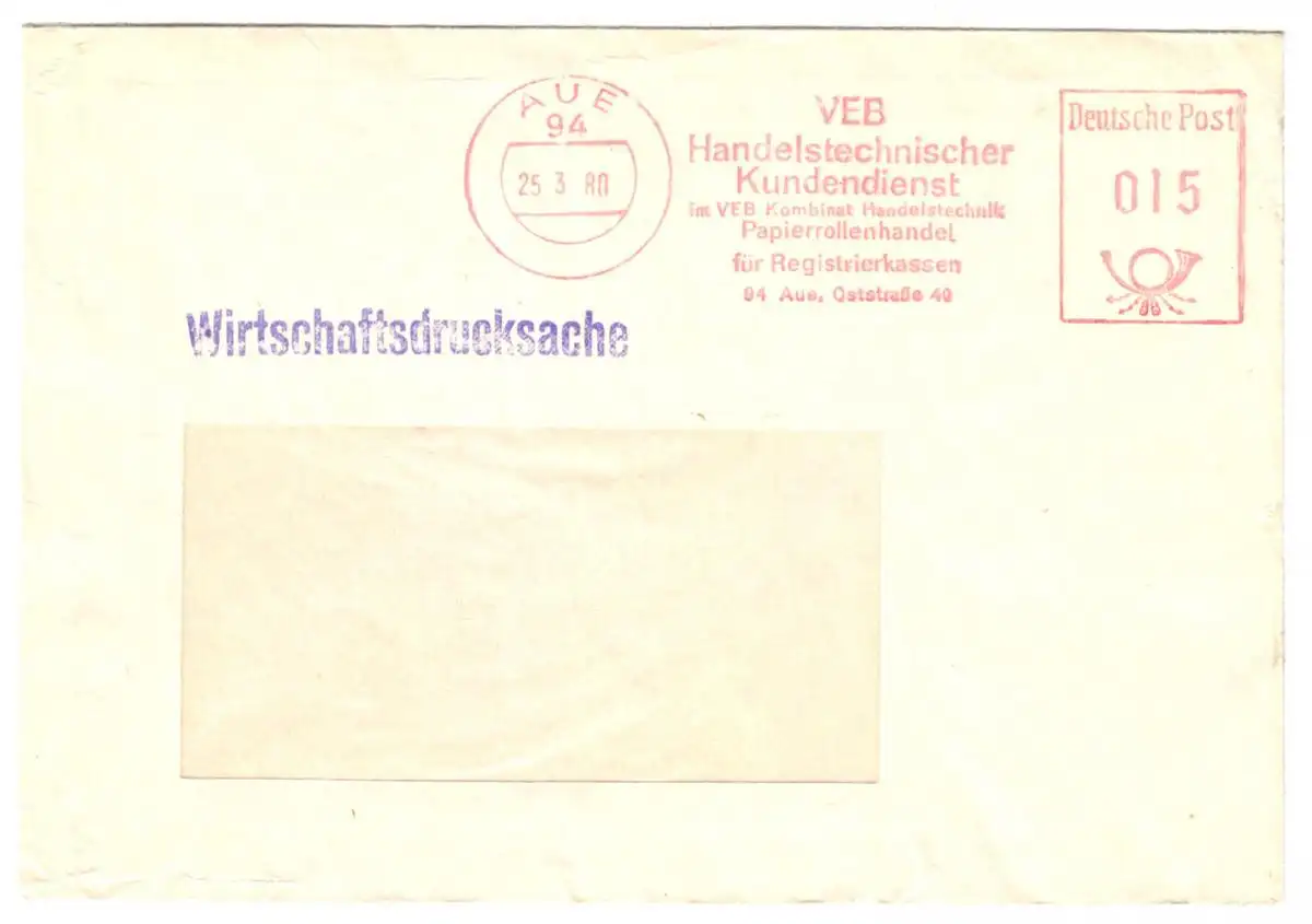 Absender: VEB Handelstechnischer Kundendienst im Kombinat Handelstechnik, Papierrollenhandel für Registrierkassen, 94 Aue, Oststr. 40 Empfänger: unbekannt, FensterbriefPorto: 015 Nebenstempel: Wirtschaftsdrucksache Anmerkungen: keine Im Inland erfolgt die Zusendung versandkostenfrei als Briefsendung der Deutschen Post AG oder eines privaten Postanbieters. Auslandsversand
