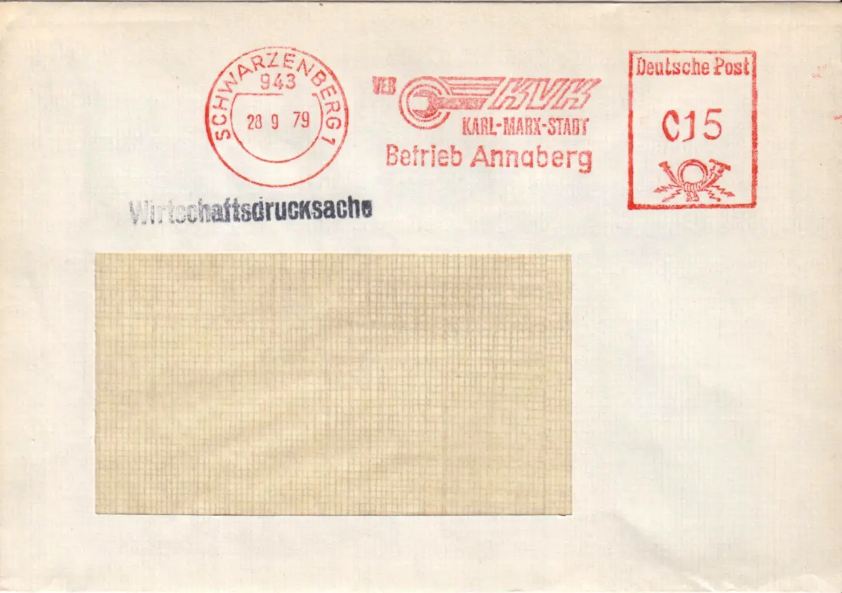 Absenderfreistempel Abbildungen: Signet des BEB KVK Karl-Marx-Stadt Absender: VEB KVK Karl-Marx-Stadt, Betrieb Annaberg Empfänger: unbekannt, Fensterbrief Nebenstempel: Wirtschaftsdrucksache Anmerkungen: keine Der
