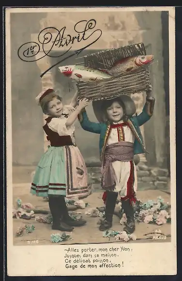 AK 1. April, Kinder in Trachten tragen Korb mit Fischen