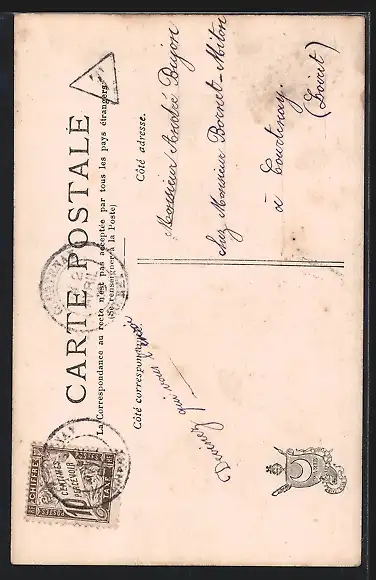 Personenbezogene Daten auf der Rückseite der Karte wurden durch blauen Textmarker unkenntlich gemacht. Die blauen Stellen sind auf die Vorderseite durchgeweicht und wirken sich negativ auf das Postkartenfoto aus