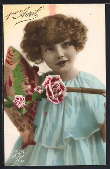 AK 1. April, Kleines Mädchen mit Fisch und Rose