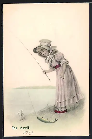 AK 1. April, Mädchen angelt einen Fisch