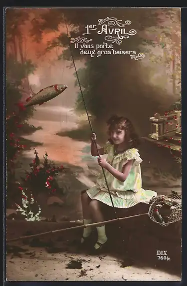 AK 1. April, Mädchen angelt einen Fisch, Il vous porte deux gros baisers