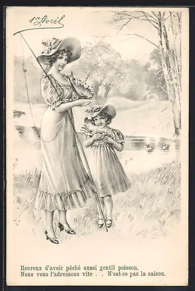 AK 1. April, Mutter und Tochter mit geangeltem Fisch