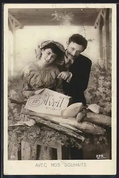 AK 1. April, Paar mit Fischen auf einem Tisch