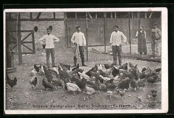 AK 1. Weltkrieg, Unsere Feldgrauen beim Hühner-Füttern
