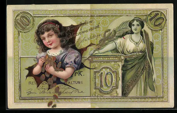 AK 10 Mark Schein, Mädchen mit Geldmünzen, Frau mit Schlangenstab, Prosit Neujahr