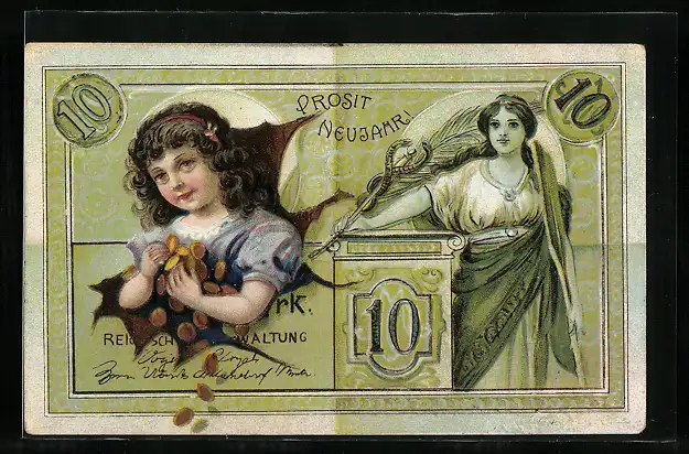 AK 10 Mark Schein, Mädchen mit Geldmünzen, Frau mit Schlangenstab, Prosit Neujahr