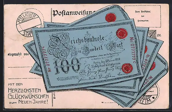 AK 100 Reichsmark-Geldscheine, Einzahlung, Neujahrskarte