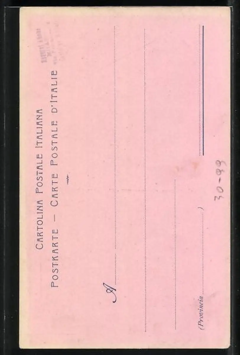 Personenbezogene Daten auf der Rückseite der Karte wurden durch blauen Textmarker unkenntlich gemacht. Die blauen Stellen sind auf die Vorderseite durchgeweicht und wirken sich negativ auf das Postkartenfoto aus