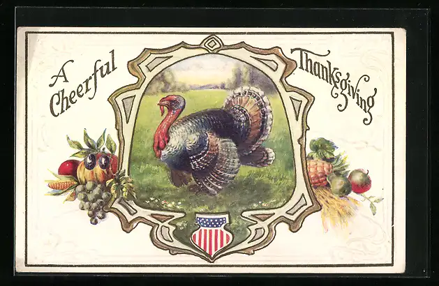 AK A Cheerful Thanksgiving, Truthahn auf einer Wiese, Passepartout mit herbstlicher Ernte