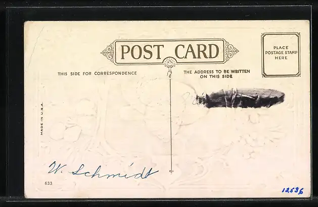 Personenbezogene Daten auf der Rückseite der Karte wurden durch blauen Textmarker unkenntlich gemacht. Die blauen Stellen sind auf die Vorderseite durchgeweicht und wirken sich negativ auf das Postkartenfoto aus