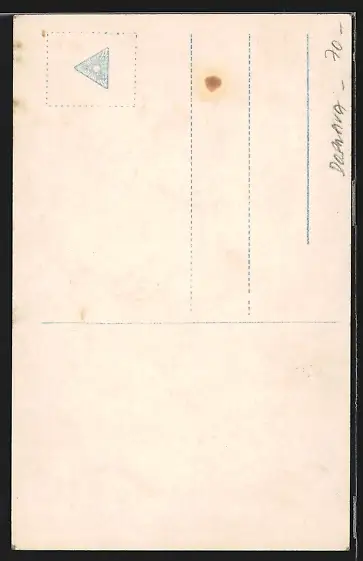 Personenbezogene Daten auf der Rückseite der Karte wurden durch blauen Textmarker unkenntlich gemacht. Die blauen Stellen sind auf die Vorderseite durchgeweicht und wirken sich negativ auf das Postkartenfoto aus